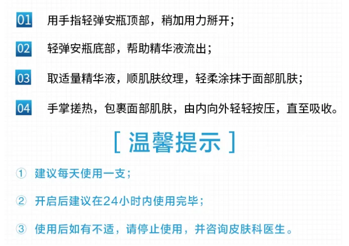 安瓶精華使用方式:在潔面后第一步使用,后續根據個(gè)人護膚習慣,配合使用其他產(chǎn)品。
